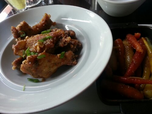 Lunch with my peeps was great. I ordered my croquettes, immediately. I had wings and ginger carrots too. My date had calamari and a salmon burger. I had a/c lemonade, apple cucumber. He had a berry drink with apple juice in it. They were both blended and super yummy. Mac and cheese was soo good. The crust on it was perfect, the mac and cheese was hot when you opened it. The calamari was nice and crispy. The wings were cooked enough to have that nice crust on it. The had a nice flavor. The carrots were the baby ones, orange and yellow. The ginger was on target, not over powering. His burger, whoa! It was big, had lox and sliced avacado along with lettuce, tomato and onion. It was marvelous. Served with fries, they were good too.